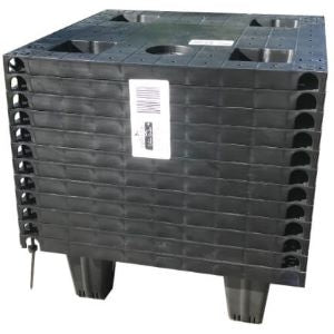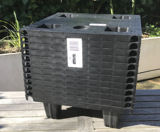 The WaterUps wicking cell is an Australian designed and manufactured product that can be used in a wide variety of garden and landscape watering environments. They are modular in design to enable the quick and easy construction of a water wicking bed - also referred to as a “self-watering” or "sub-irrigated" bed. Each WaterUps wicking cell is 400mm(L) x 400mm(W) x 130mm(H) with provision for an inlet and overflow pipe. The cells are manufactured from recycled polypropylene and are comprised of a rigid deck with 4 “wicking legs” that can be interlocked to form a raised platform or cut to shape to form a space that has a water reservoir below. Each cell is designed to allow the legs to be filled with soil/potting mix to act as wicks. These wicks allow water from the reservoir to moisten the soil layer above the cell base by the process of capillary action. The cells are connected with cross-shaped joiners which, due to their modular nature, allow the cells to fit any size or shape garden bed configuration. When constructed, the WaterUps wicking cells can store around 120 litres of water below each square metre of cells. WaterUps wicking cells weigh approximately 800gms each, are stackable, and come in packs of 12, which with a combined weight under 10kg, makes them easy to carry. They can also be cut to shape or size using a jigsaw or hand saw to fit into narrower or irregular shaped spaces. The system is filled directly to the reservoir below via the inlet pipe using a garden hose. In the event of heavy rain, any water that passes through the soil to the reservoir will be reused. Excess water will flow out of the bed via the overflow pipe, thereby resulting in excellent drainage to avoid the bed becoming waterlogged. There is always an air space between the soil above and the water below allowing the soil to breathe.